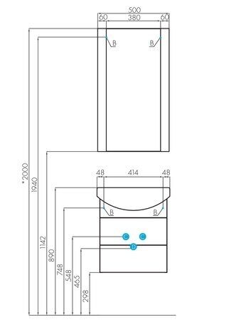 Набор мебели в ванную комнату Ария 50 М состоит из подвесной тумбы, зеркала и подвесного шкафа-колонны. В тумбе за фасадом расположены 2 ящика из декоративной влагостойкой ДСП со вставками, организующими его пространство.