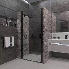 Размеры: 120х195см. Прозрачное стекло 6мм. Профиль: черный, анодированный алюминий. Распашная дверь. Дверь открывается в обе стороны
