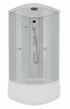 Размеры: 100х100х215 см. Крыша: есть. Вход: спереди. Форма: 1/4 круга. Высокий поддон, материал - АБС-пластик, высота - 40, глубина - 27 см. Задние стенки: закаленное стекло матовое. Двери: 2 шт, раздвижные, стекло закаленное матовое - 4мм. Профиль алюминиевый белый. Ширина входа: 46 см. Комплектация: ручной душ, полочка (опция), тропический душ (верхний). Управление: ручное