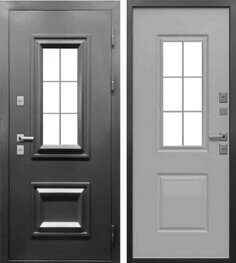 Внешнее покрытие: атмосферостойкое порошково-полимерное «Букле графит». Внутреннее покрытие: фрезерованная МДФ панель 10 мм, цвет – Бетон Лофт грей. Толщина дверного полотна: 110 мм. Глубина короба: 131 мм. Замки: 2 сувальдных Гардиан. Терморазрыв 24 мм: двухкамерный спейсер из ПВХ.