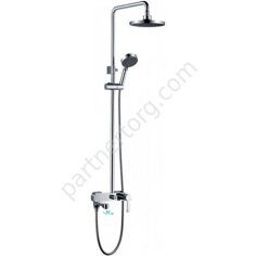 Размеры: max высота 157см. Цвет: белый, хром. Материал: латунь. Монтаж: на стену. Тип: со смесителем, с изливом. В комплекте: тропический круглый душ 20х30см, Душевая лейка с выдвижным держателем, душевой шланг.