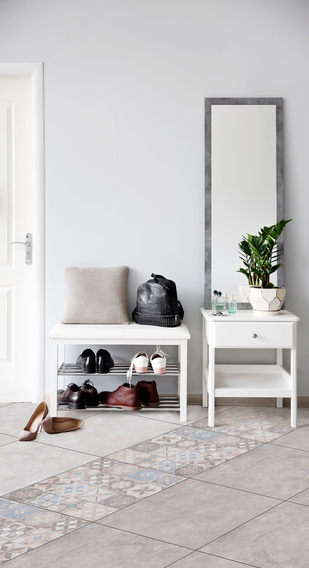 Так и плитка в этой поверхности сочетает в себе фактуру цемента с нежностью цветовой палитры декора. Светло-серый и темно-серый керамогранит – основа коллекции, а декоративная часть выполнена в виде пэчворка, которая как раз и отличается сложностью рисунка. Серо-голубые и пудро-розовые элементы складываются в причудливые геометрические паттерны, а издалека они похожи и на цветы.