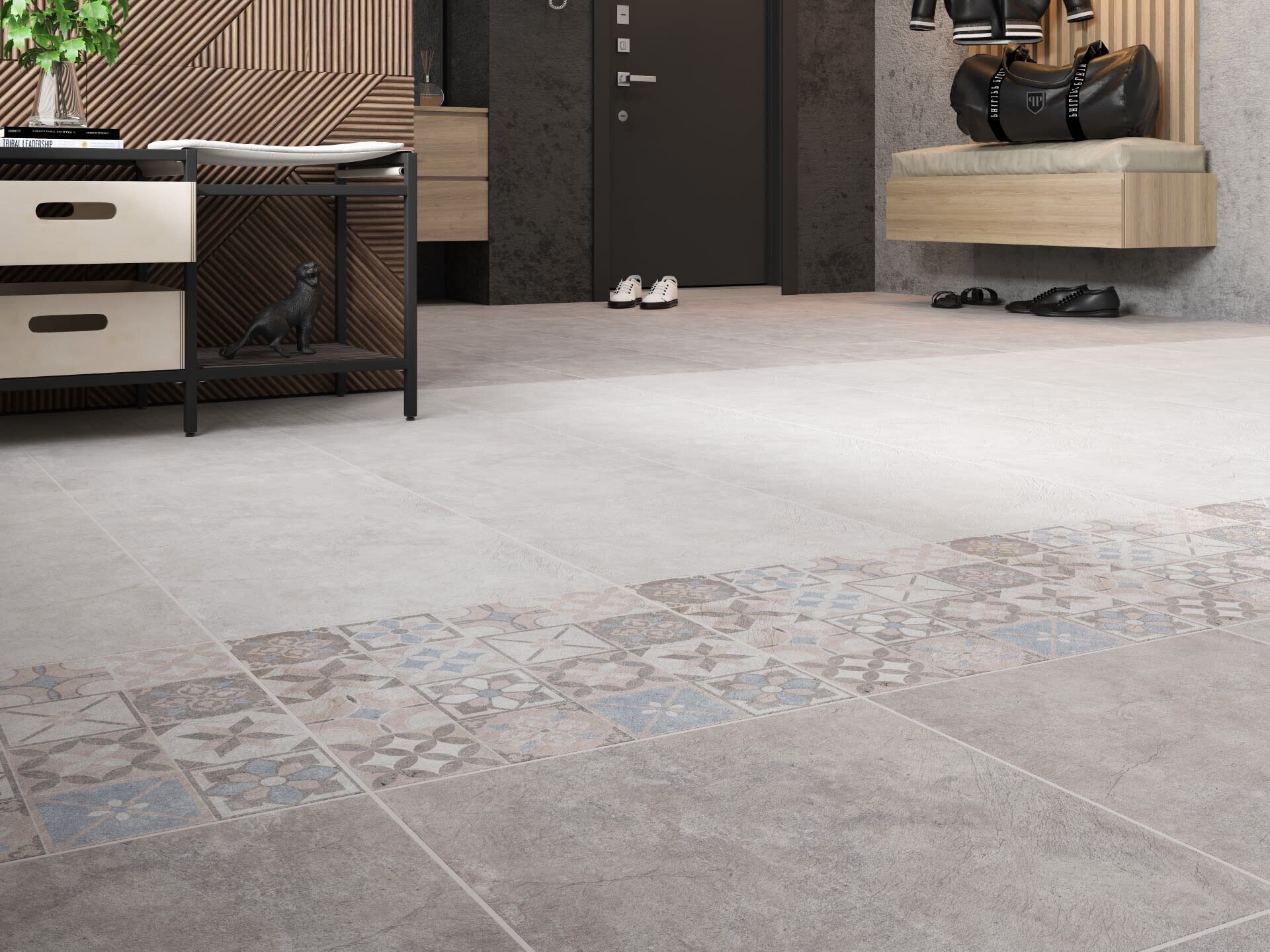 Основная часть коллекции идеально ляжет на пол в помещениях, оформленных в стиле лофт. Но с добавлением декора «Македонию» выигрышно использовать для ванных комнат, холлов, а также комнат с минималистичным интерьером.