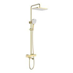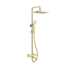 Высота 148см. Верхний душ 25х25см. Назначение: для душа, для ванны. Материал: латунь. Держатель лейки на стойке. Термостат. Цвет: сатин золотой