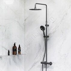 Высота 148см. Верхний душ 25х25см. Назначение: для душа, для ванны. Материал: латунь. Держатель лейки на стойке. Термостат. Цвет: графит