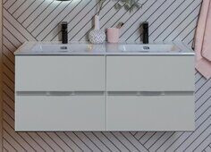 Размер тумбы: 60х45х53,1 см. Цвет: белый матовый. Комплект: 4 ящика, раковина-столешница Flat 120 двойная