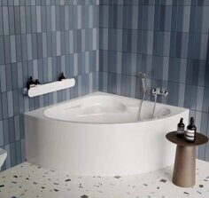 Производители предлагают ванны длиной 140 см в разных конфигурациях: прямоугольные, угловые, асимметричные. Прямоугольные модели — классика, подходящая под любой ремонт. Угловые ванны 140 см — отличное решение для нестандартных планировок: они эффективно используют пространство в углу комнаты и часто дополняются функциями гидромассажа.