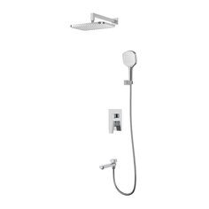 Цвет: хром. Материал: латунь. Монтаж: на стену, на три отверстия. Тропический душ, ручной душ, со смесителем, с поворотным изливом