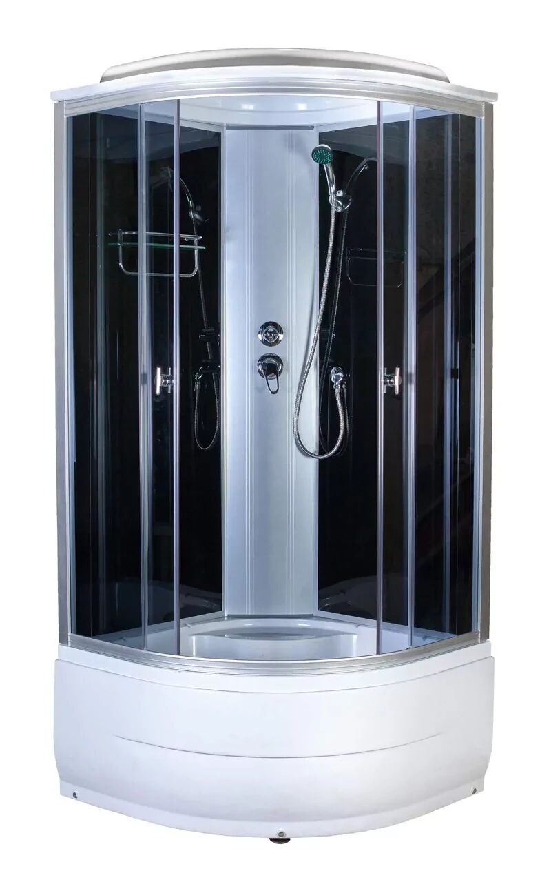 Размеры: 80*80*220 см. Глубокий поддон. Задние стенки: черное стекло. Задняя панель из ABS. Дверки: темное стекло. Оснащение: полочка для шампуня с полотенцедержателем, верхний душ, ручной душ-лейка, слив «монетка».