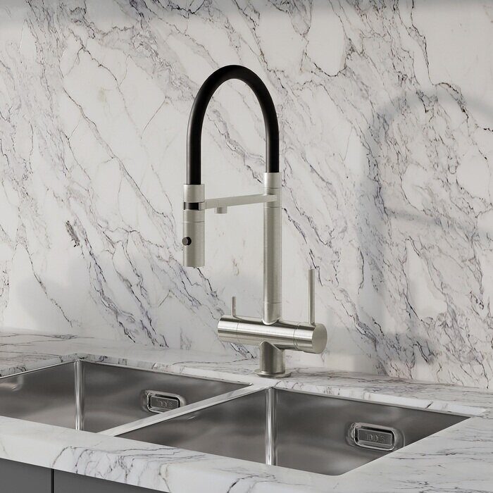 Профессиональный смеситель для кухни Ace в цвете графит с черным гибким изливом и отдельным каналом для фильтрованной воды. Продуманный и функциональный, он успешно справляется с повседневными задачами на кухне.