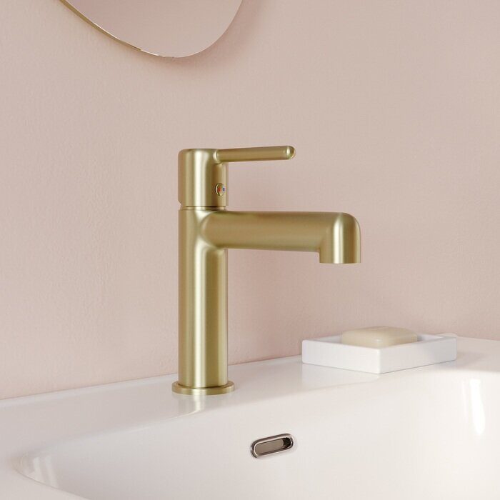 Стильный смеситель для умывальника, где удачно сочетает актуальный современный дизайн и новый трендовый оттенок матового золота с брашированным покрытием. Тонкая удлиненная ручка добавляет смесителю изящества и комфорт в управлении. Расстояние между ручкой и изливом увеличено для большего удобства.