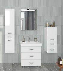 Размер: 85х55х13 см. Цвет: белый. Комплект: Полка стеклянная - 2 шт., Регулируемые навес - 2 шт., Фасад - 1 шт. (петли с интегрированной системой плавного закрывания)