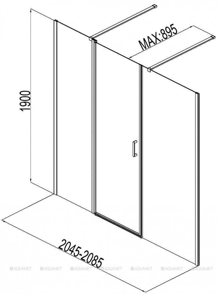 Размер: 206,5х190 см. Профиль алюминий, хром. Стекло: прозрачное, 6 мм. Дверь распашная. Поддон приобретается отдельно.