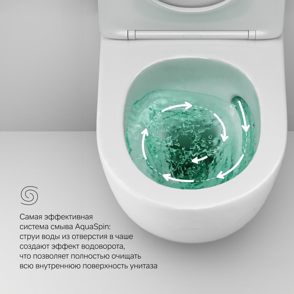 Подвесной унитаз Like c технологией смыва AquaSpin. Новая инновационная система использует вихревой поток воды для самого эффективного очищения чаши унитаза.