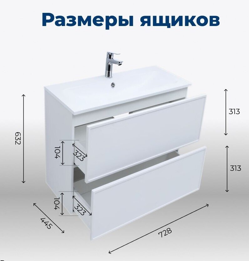 Размер: 72,8х44,5х63,2 см. Цвет: белый матовый. Комплект: 2 ящика, раковина-столешница Арт 75