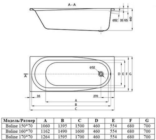 Размер (мм +-3): 1500х700. Высота 440мм. Объем 180л. Глубина 440мм.