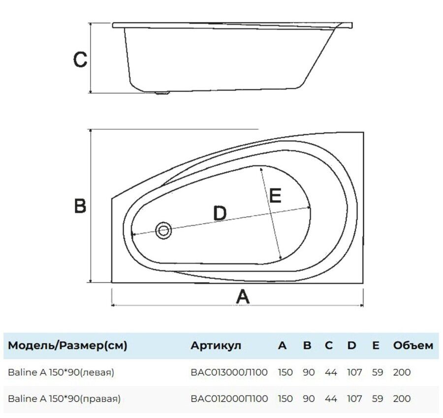 Baline ванна акриловая угловая асимметричная 150х90 Alba Spa.