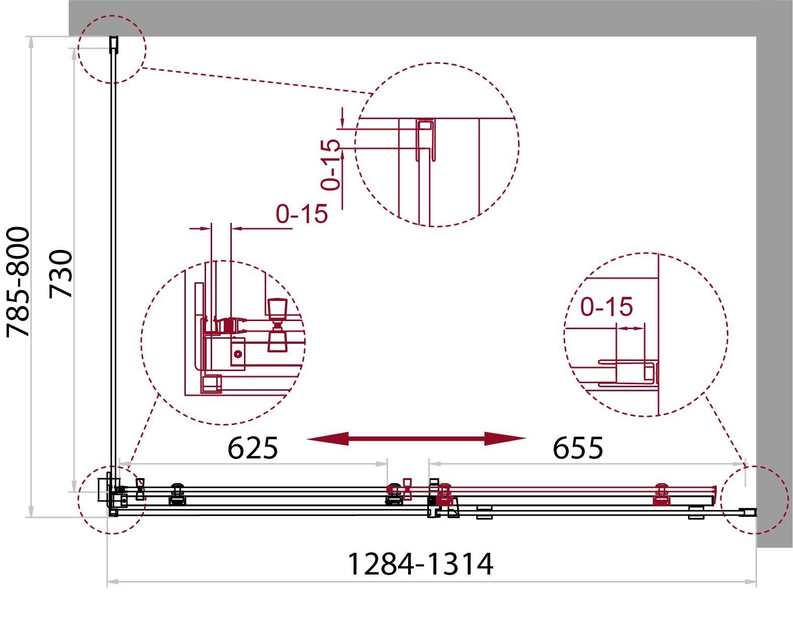 Размер: 130х80x195 см. Профиль: анодированный алюминий, хром. Стекло закаленное прозрачное 8 мм. Дверь: раздвижная, двойные подшипниковые ролики. Ширина входа: 62,5 см
