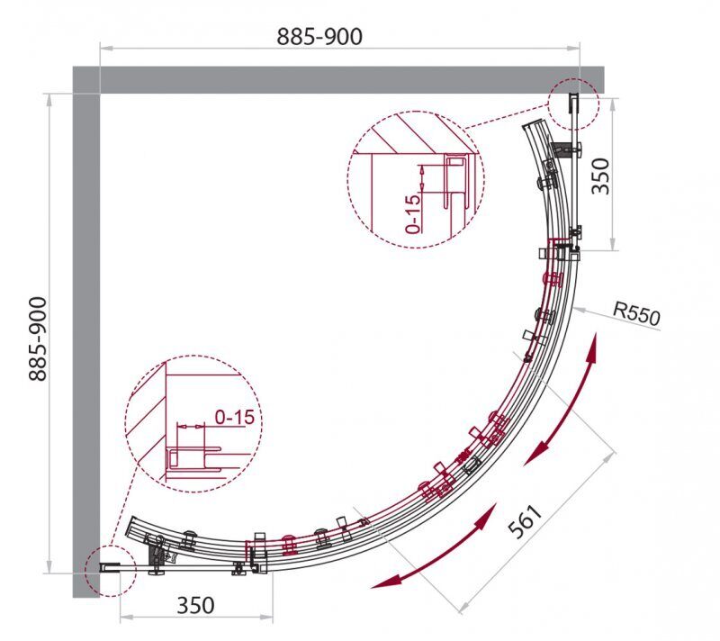 Размер: 90х90x195 см. Профиль: анодированный алюминий, черный. Стекло закаленное прозрачное 8 мм. Дверь: раздвижная, двойные подшипниковые ролики. Ширина входа: 50 см