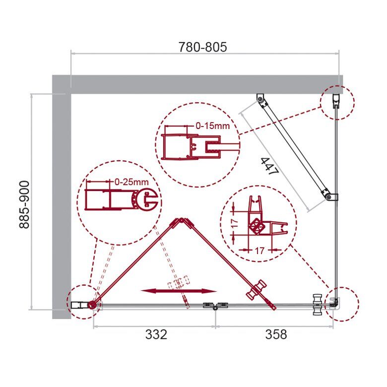 Размер: 80х90x195 см. Профиль: анодированный алюминий, хром. Стекло закаленное прозрачное 6 мм. Дверь: складная. Ширина входа: 69 см. Габариты с регулировками, см: (78-80,5)x(88,5-90).
