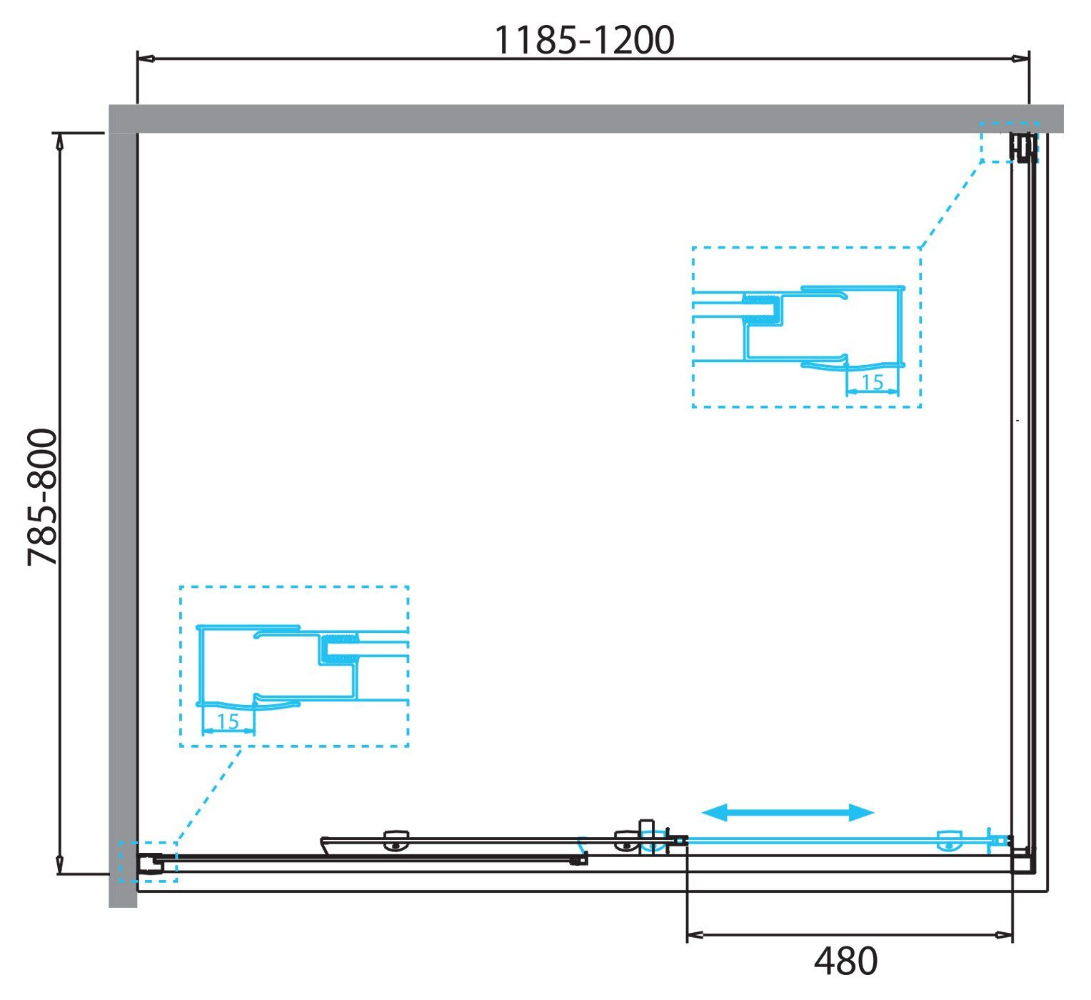 Размер: 120х90x195 см. Профиль: анодированный алюминий, хром. Стекло закаленное прозрачное 6 мм. Дверь: распашная. Ширина входа: 59 см. Габариты с регулировками, см: (118.5-120)-(88.5-90).