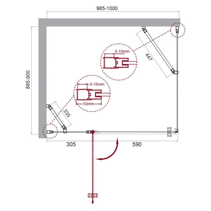 Размер: 100х90x195 см. Профиль: анодированный алюминий, хром. Стекло закаленное прозрачное 6 мм. Дверь: распашная. Ширина входа: 59 см. Габариты с регулировками, см: (98.5-100)-(88.5-90).