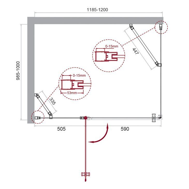 Размер: 120х100x195 см. Профиль: анодированный алюминий, хром. Стекло закаленное прозрачное 6 мм. Дверь: распашная. Ширина входа: 59 см. Габариты с регулировками, см: (118.5-120)-(98.5-100).