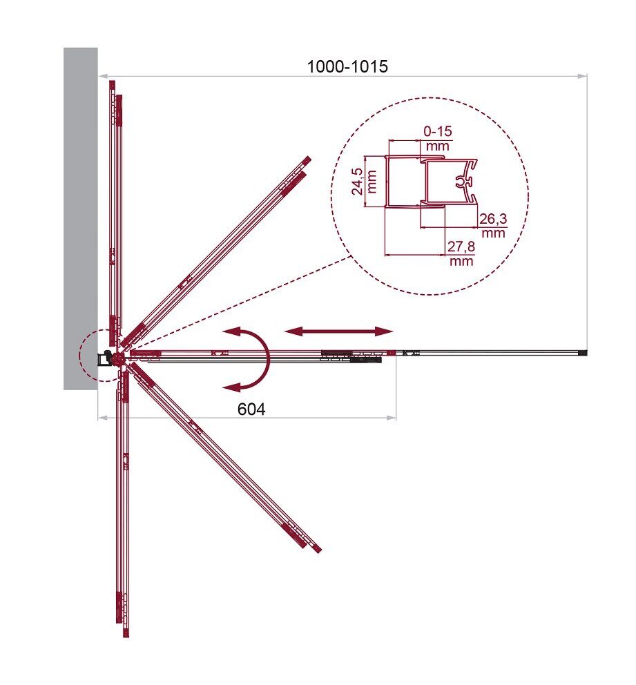 Размер: с регулировками: 100х145см. Профиль алюминиевый, хром. Стекло закаленное прозрачное 6 мм. Конструкция двери: поворотная цилиндрическая петля и выдвижная створка.