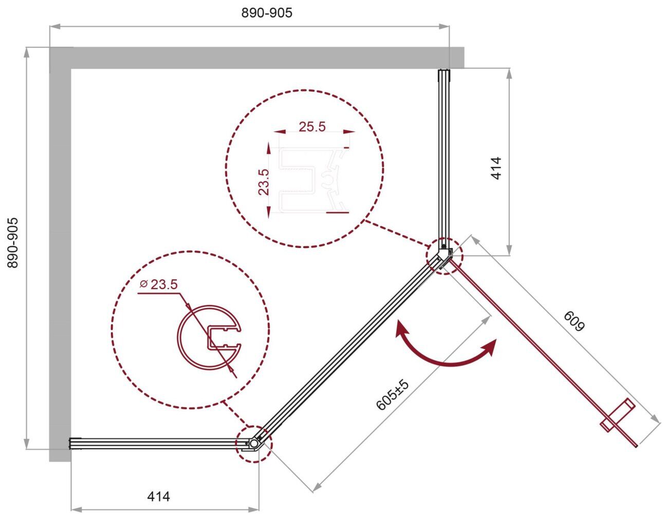 Размер: 90х90х195 см.  Ширина входа, см: 60,5