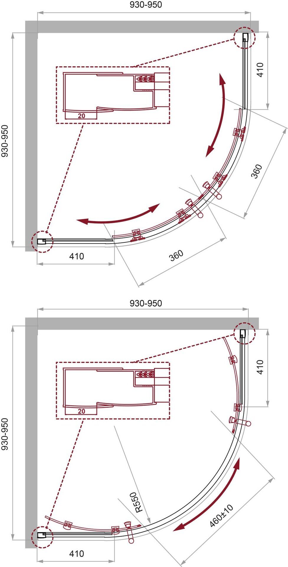 Размер: 95х95x195 см. Профиль: анодированный алюминий, хром. Стекло закаленное прозрачное 5 мм. Раздвижная конструкция (две двери). Ширина входа: 46 см