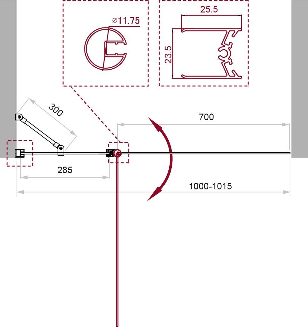 Размер: с регулировками: 100х150 см. Профиль алюминиевый, хром. Стекло закаленное прозрачное 5 мм. Конструкция двери: распашная, открытие створки возможно внутрь и наружу.
