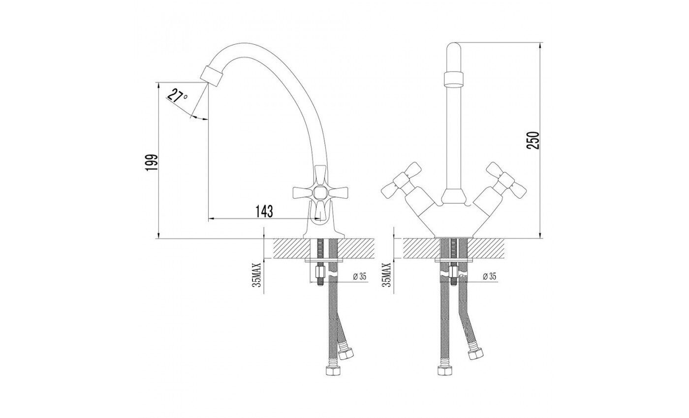 Размер: 23×36×5 см. Излив поворотный, длина 19,1 см, высота 35 см. Материал: латунь. Комплект: Аэратор, Керамический картридж 35 мм, Гибкая подводка 1/2” 50 см, Металлическая рукоятка