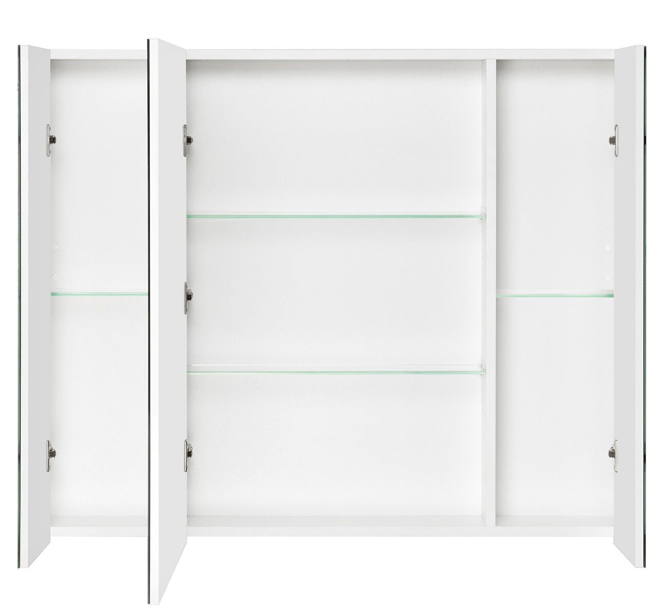 Размер: 81х100х15 см. Цвет: белый. Комплект: Навес - 2 шт., Полка стеклянная - 4 шт., Петли с интегрированной системой плавного закрывания - 7 шт., Зеркальный фасад створка - 3 шт.
