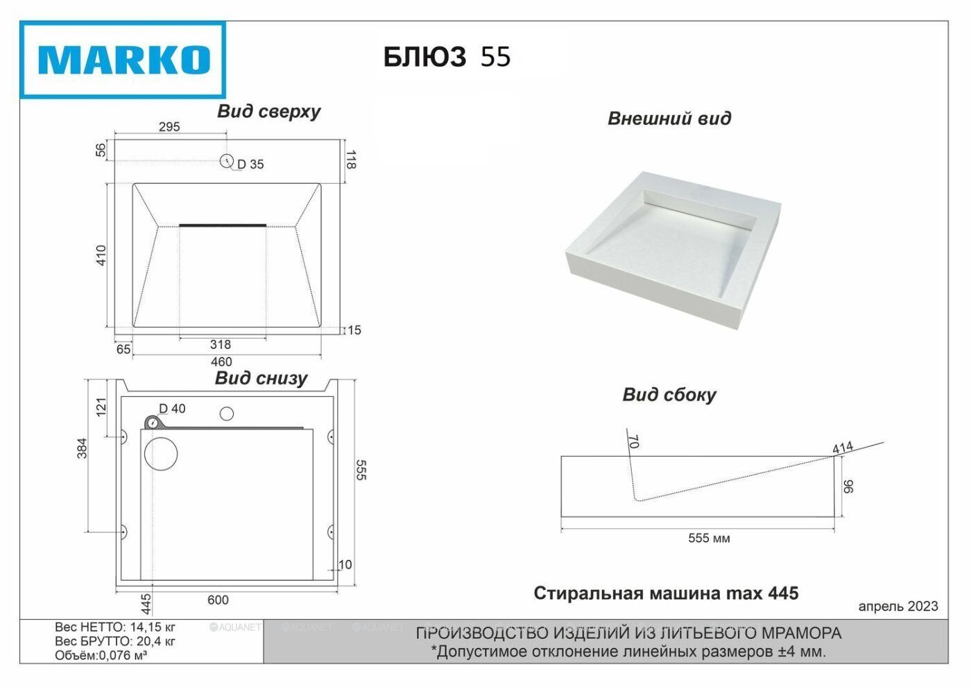 Блюз 55 раковина из литьевого мрамора для монтажа над стиральной машиной Aquanet