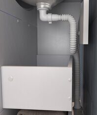 Оснащение: 2 выдвижных ящика, шариковые направляющие полного выдвижения, 2 квадратные регулируемые опоры (матовый хром), 2 кухонные опоры, сифон