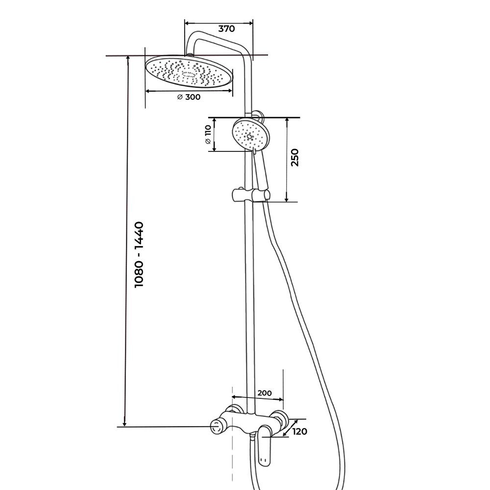 Высота 108-144см.  Верхний душ 30х30см. Ручная лейка 11х11см. Материал основной: латунь.  Цвет: Оружейная сталь