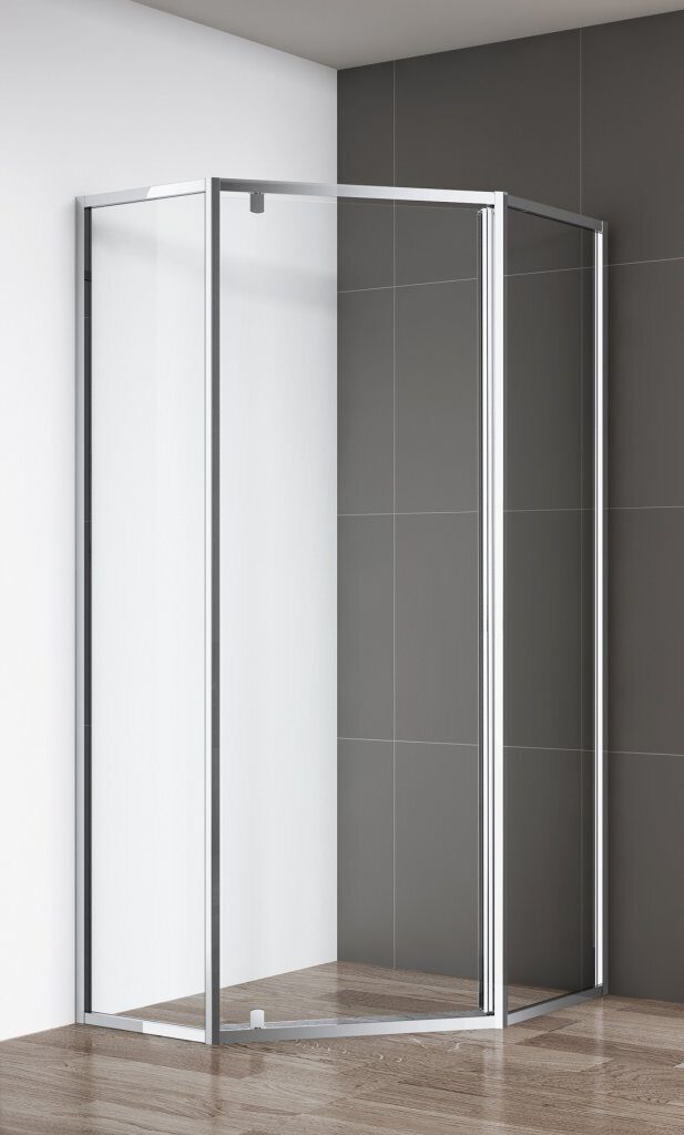 Размер: 100х100x195 см. Профиль: анодированный алюминий, хром. Стекло закаленное прозрачное 6 мм. Форма: пятиугольная. Дверь: распашная. Ширина входа: 65,3 см. Габариты с регулировками, см: (97,9-99,5)x(97,9-99,5).