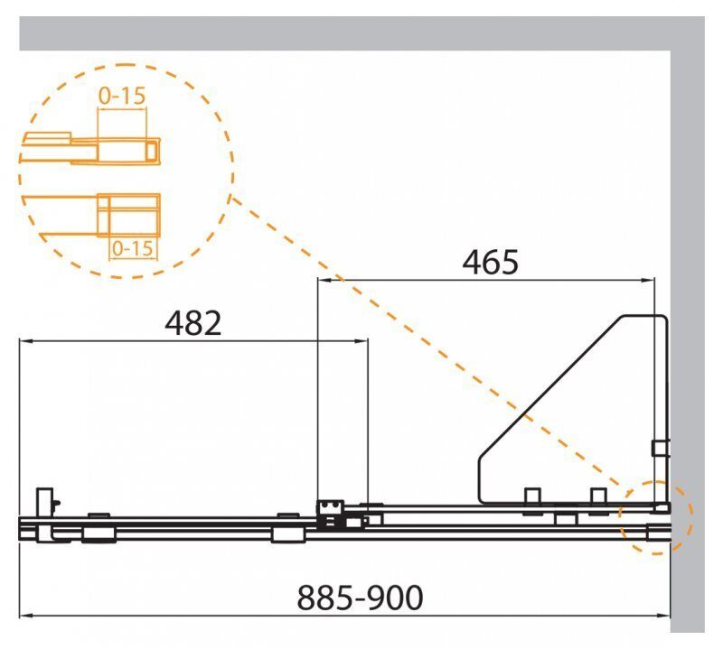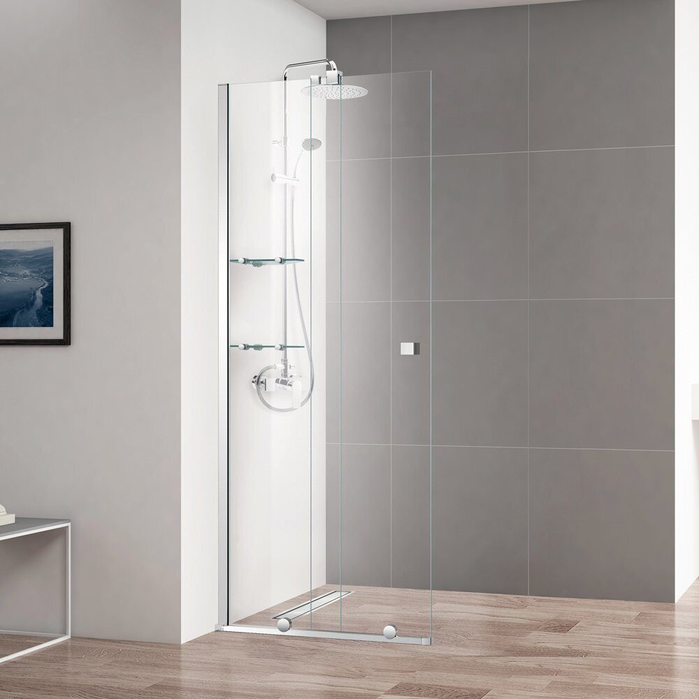 Размер: 90х195 см. Профиль: анодированный алюминий, хром. Стекло закаленное прозрачное 8 мм. В стандартную комплектацию входят две стеклянные угловые полочки с хромированными держателями.
