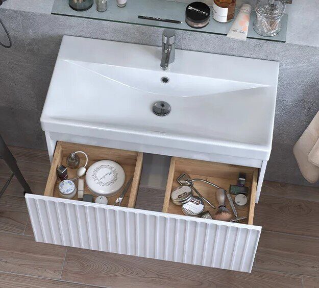 Материалы тумбы:  МДФ, влагостойкая ЛДСП, полимерное покрытие ПВХ, врезная ручка, европейская фурнитура