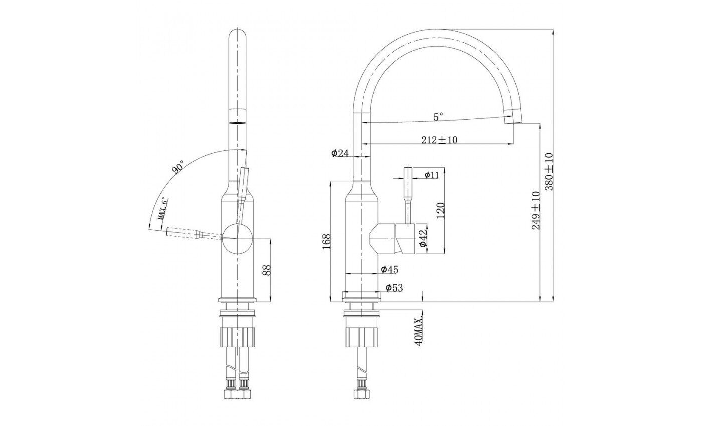 Размер: 32×40×7 см. Излив поворотный, длина 21,2 см, высота 38 см. Материал: латунь. Комплект: Аэратор, Керамический картридж 35 мм, Гибкая подводка 1/2” 60 см