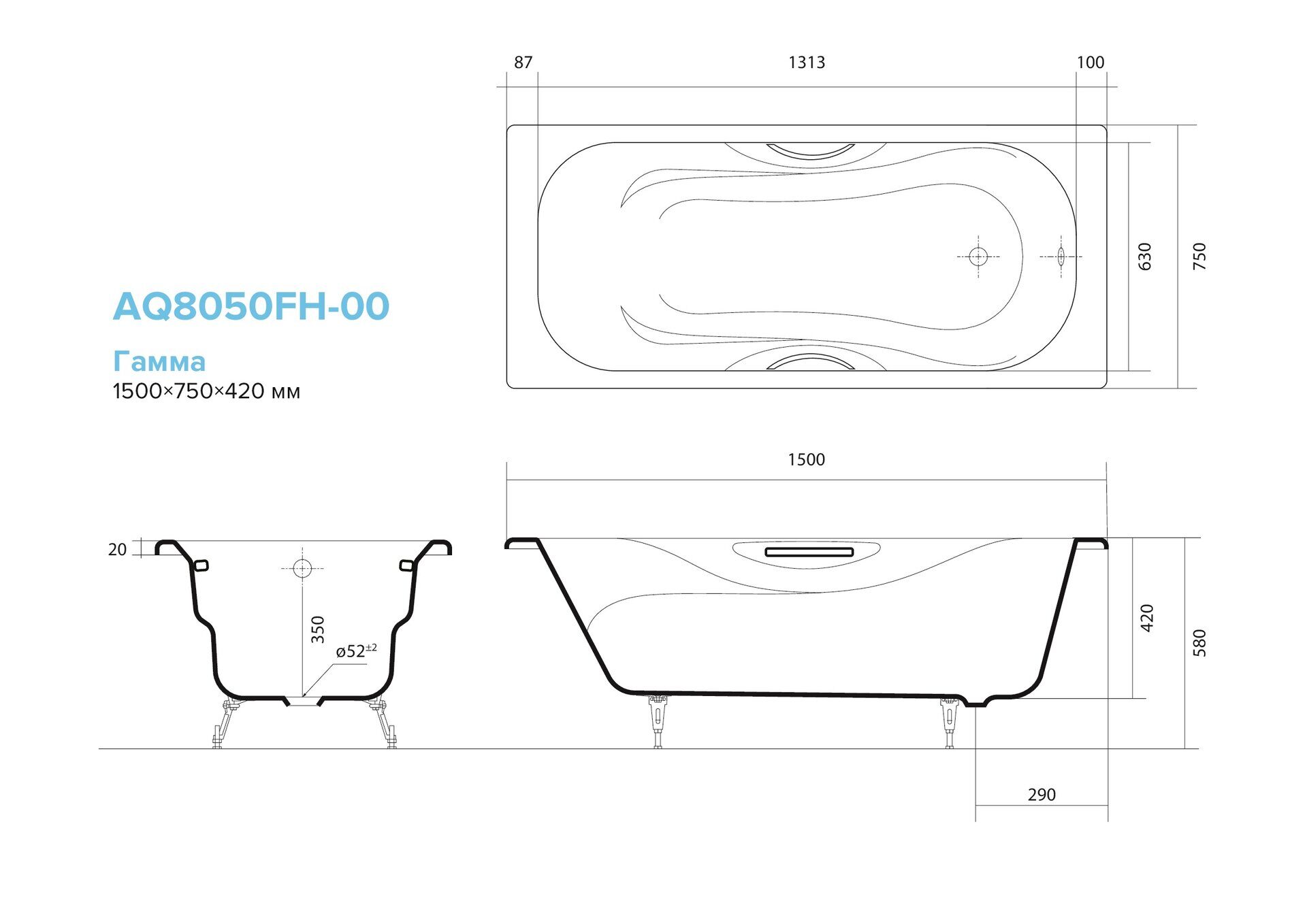 Главная Каталог магазина Сантехника Ванны Гамма 150x75см ванна чугунная с ручками и ножками