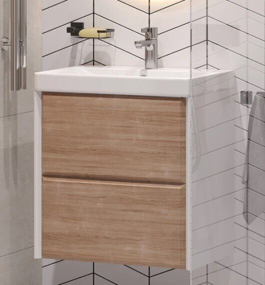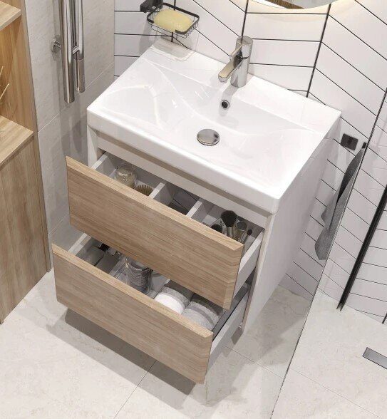 Размер: 59х39х59,2. Цвет: дуб сонома/белая. Два выдвижных ящика с системой открывания push-to-ope. Раковина керамическая 9696-60 см в комплекте