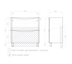 Оснащение: 2 выдвижных ящика, скрытые направляющие Hafele, интегрированная ручка, 2 навеса, 2 опоры квадратные регулируемые, 1 сифон