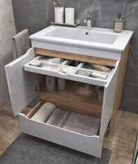 Размер: 76,8х45,2х75 см. Цвет: белый/под дерево. Комплект: 2 дверцы, 1 ящик, выдвижной органайзер для мелочей, 2 опоры квадратные регулируемые, 2 кухонные опоры