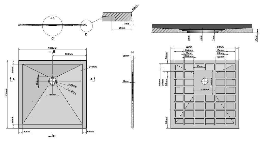 Размер: 100х100см. Глубина 2,5мм. Материал искусственный камень. Поверхность: антискользящий, массажный рельеф.   Максимальная нагрузка на поддон, кг 430кг.