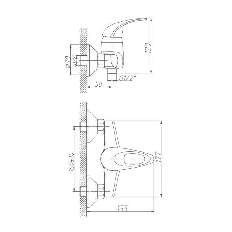 Комплект: смеситель, душевой шланг, душевая лейка, держатель лейки, эксцентрики, декоративные чашки, инструкция.. Управление - Рычажное.
