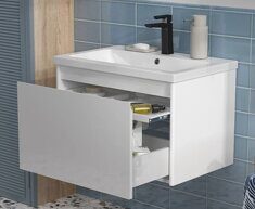 Комплект поставки: ручка - 3 шт., Полка - 2 шт., Выдвижной ящик (направляющие с интегрированной системой плавного закрывания) - 1 шт., Фасад створка (петли с интегрированной системой плавного закрывания) - 2 шт., Внутренний ящик с системой push-to-open - 1 шт., Усиленный кронштейн для подвески - 2 шт., Коврик против скольжения - 4 шт. Раковина Шерилл 105