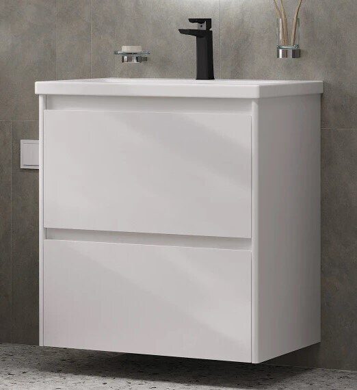 Размер (см): 49,3х58,2х42,9. Цвет: белый. Комплект: Регулируемый навес - 2 шт., Ручка - 1 шт., Выдвижной ящик (направляющие с интегрированной системой плавного закрывания) - 2 шт. Раковина Миранда 60