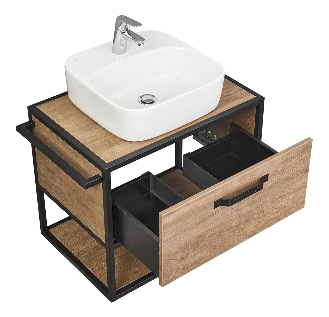 Тумба Лофт Фабрик 65 в цвете Дуб Кантри – это сочетание насыщенного древесного декора и благородства металла. Удобный вместительный ящик, снабженный направляющими плавного выдвижения, и открытая нижняя полка позволят разместить все необходимое. Для данной тумбы доступно два варианта комплектации: с раковиной Фабиа 65 из прочного литого мрамора и с накладной керамической раковиной на столешницу. Оригинальная ручка идеально сочетается с металлическими черными профилями и полотенцедержателем. Полотенцедержатель можно установить опционально по желанию клиента слева