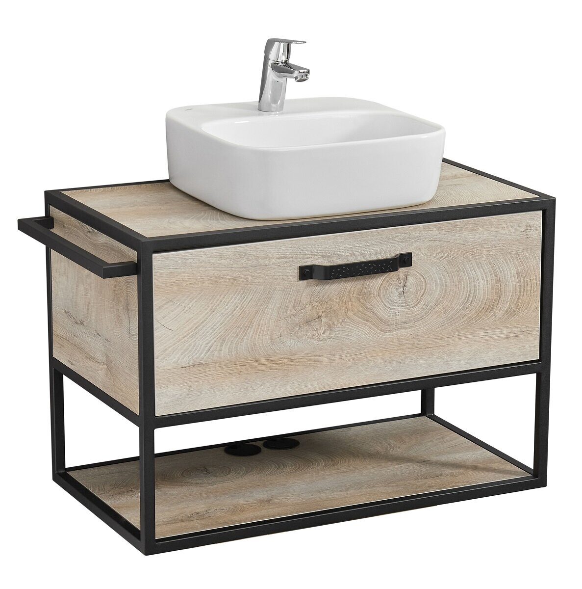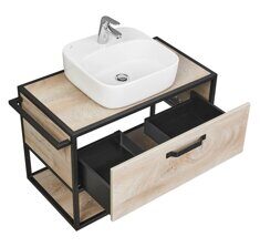 Тумба Лофт Фабрик 80 в цвете Дуб Эндгрейн – это сочетание насыщенного древесного декора и благородства металла. Удобный вместительный ящик, снабженный направляющими плавного выдвижения, и открытая нижняя полка позволят разместить все необходимое. Для данной тумбы доступно три варианта комплектации: с керамической раковиной Victoria от бренда Roca, с раковиной Фабиа 80 из прочного литого мрамора и с накладной керамической раковиной на столешницу. Оригинальная ручка идеально сочетается с металлическими черными профилями и полотенцедержателем. Полотенцедержатель можно установить опционально по желанию клиента слева или справа.